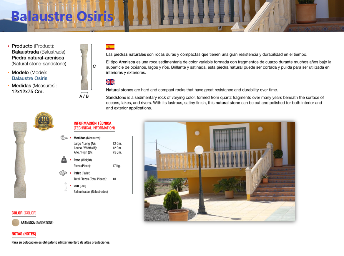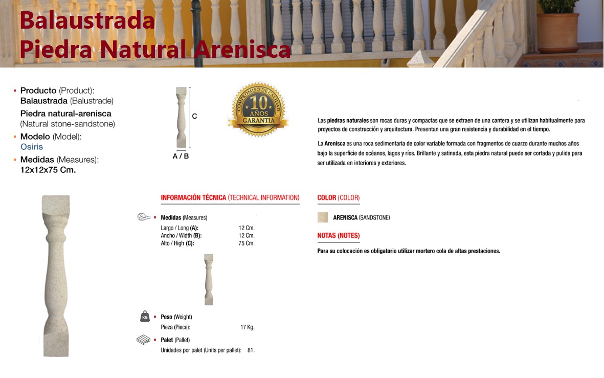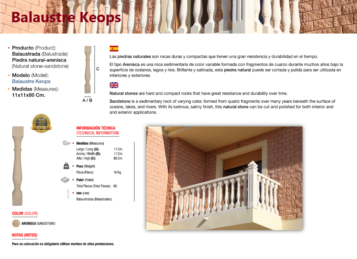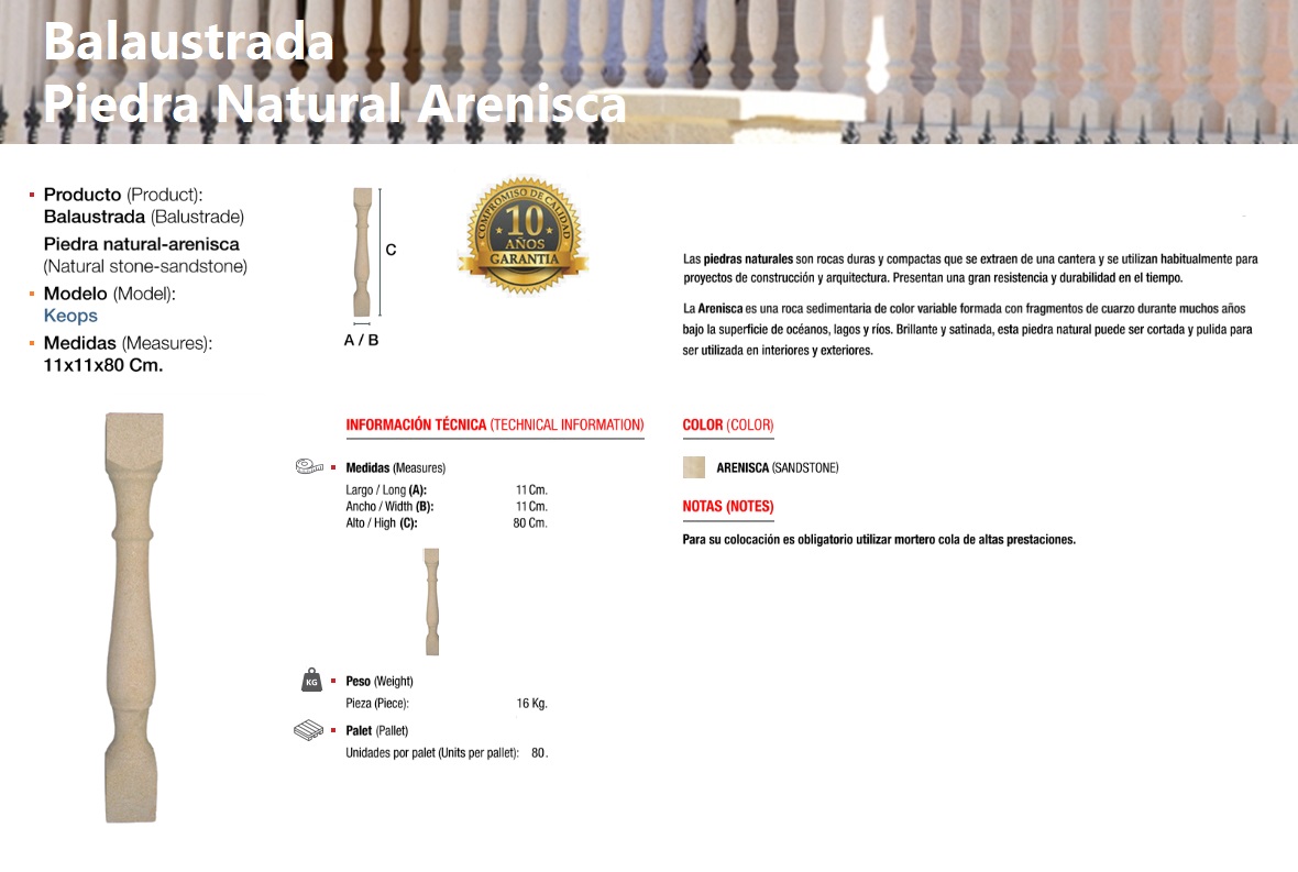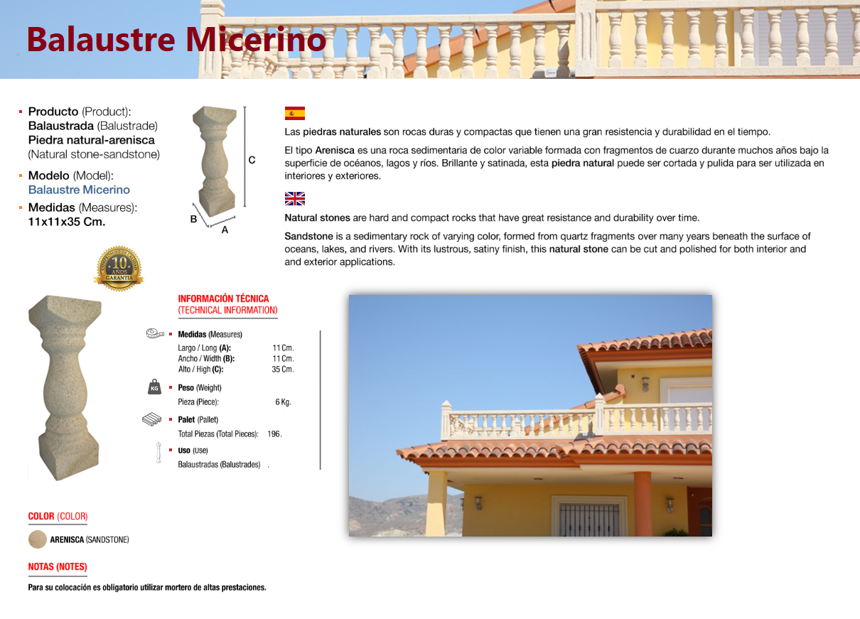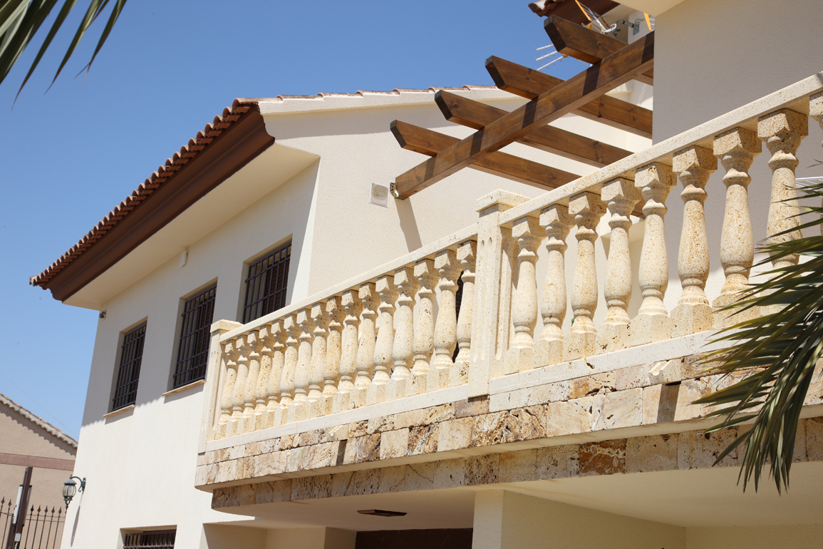 Pieces carved from a solid block of natural stone, specifically sandstone, a sedimentary detrital rock. A baluster (from Greek balaustion and Latin balaustium, meaning "pomegranate flower") is a molded form in natural or artificial stone that supports the top rail of balcony and terrace parapets or stair railings. The set of balusters is called a balustrade.
