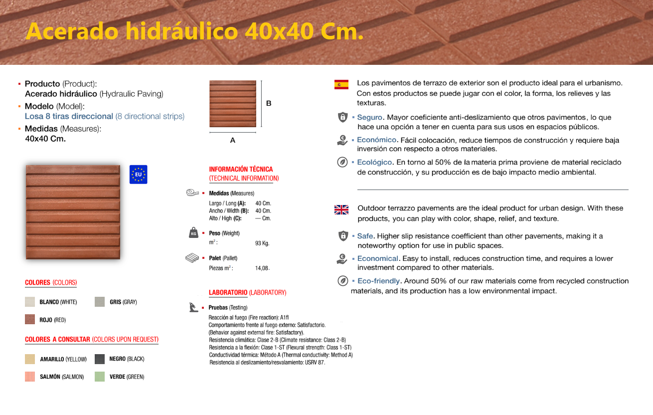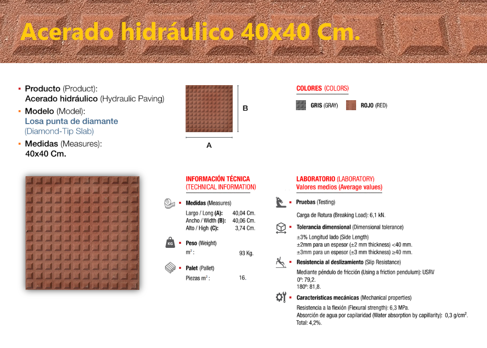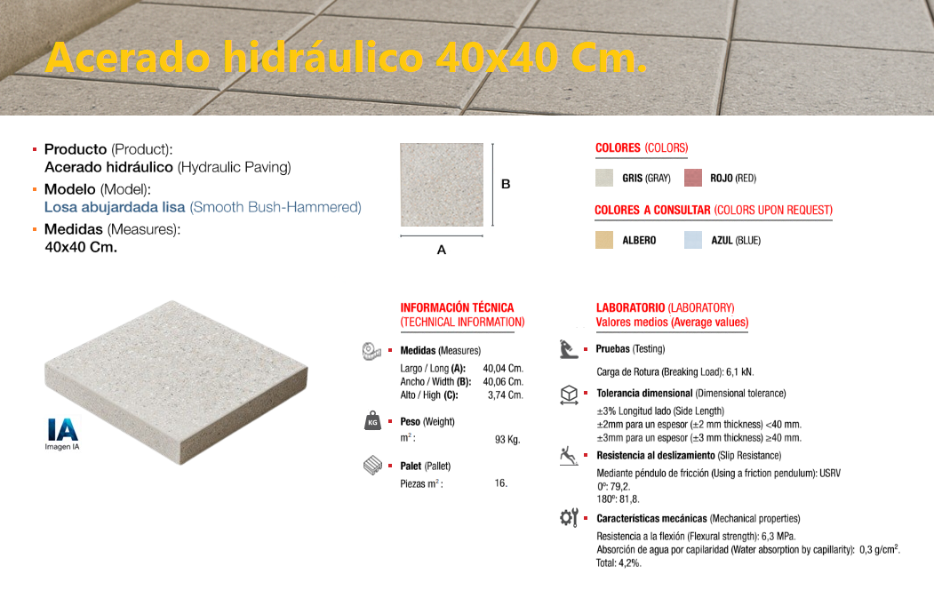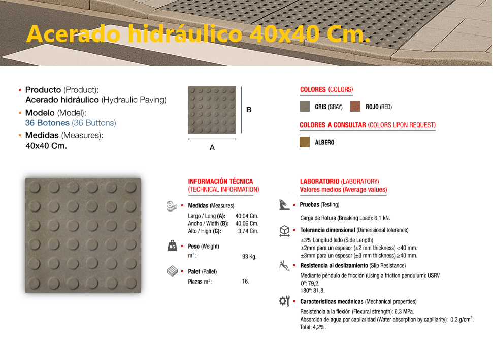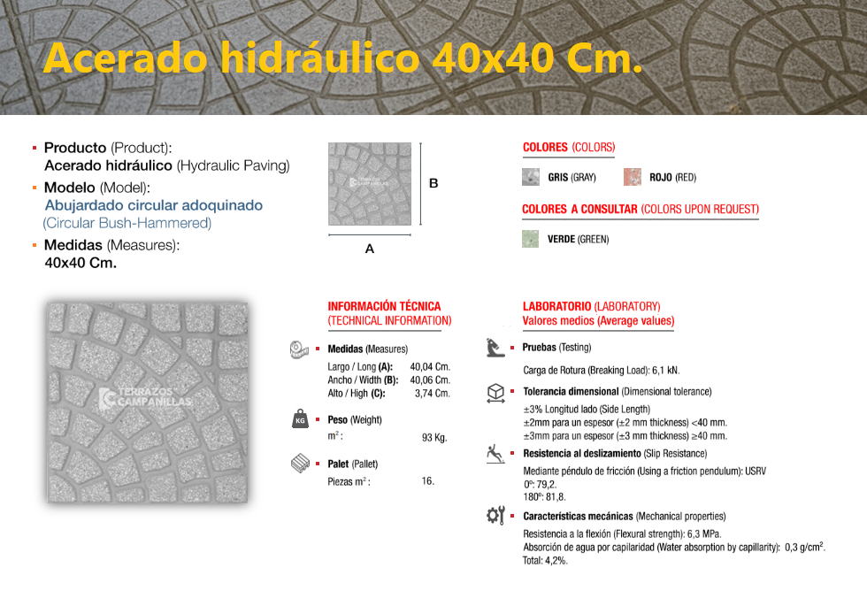 El acerado hidráulico es una solería compuesta de áridos (de diferentes granulometrías) cementos y colorantes, el cual se compacta y se deja sin pulir, llevando tan solo grabada, en su cara vista, el dibujo que le confiere su nombre característico, dándole un perfecto acabado estético y antideslizante, ideal para su colocación en zonas de paso en el exterior, especialmente en zonas públicas.