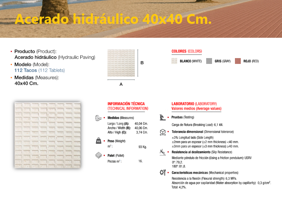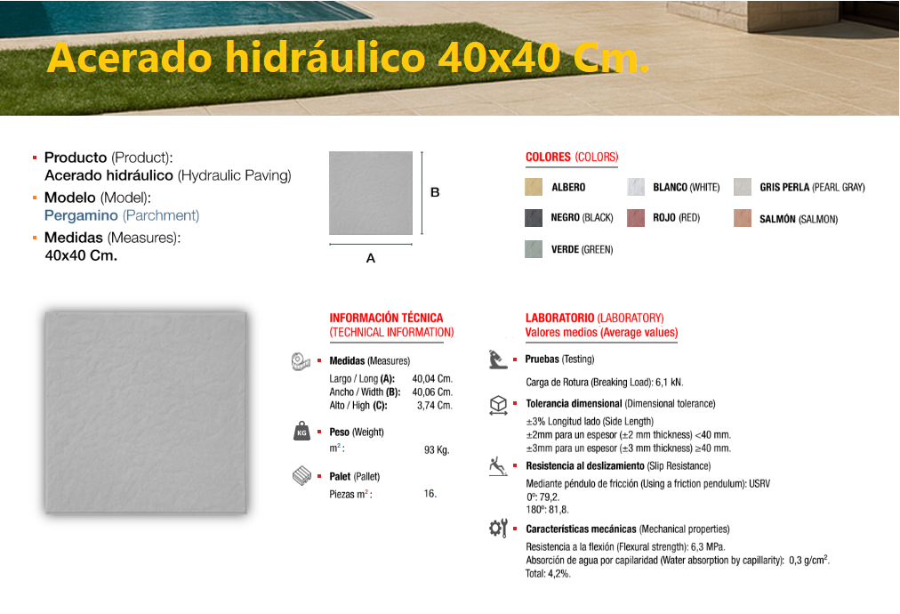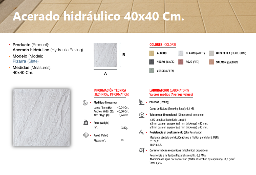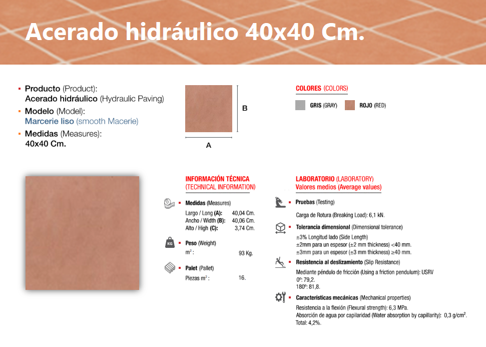 El acerado hidráulico es una solería compuesta de áridos (de diferentes granulometrías) cementos y colorantes, el cual se compacta y se deja sin pulir, llevando tan solo grabada, en su cara vista, el dibujo que le confiere su nombre característico, dándole un perfecto acabado estético y antideslizante, ideal para su colocación en zonas de paso en el exterior, especialmente en zonas públicas.
