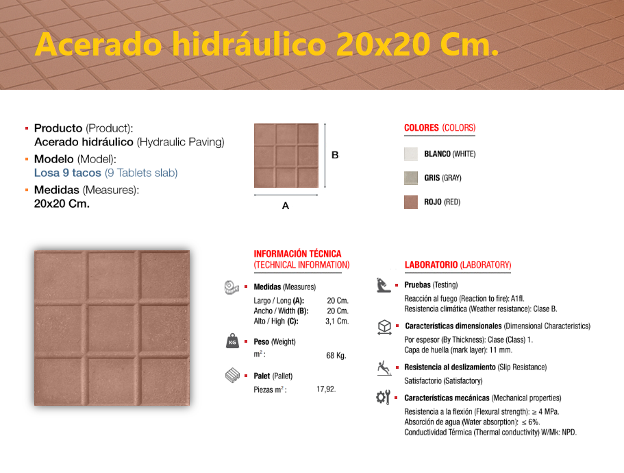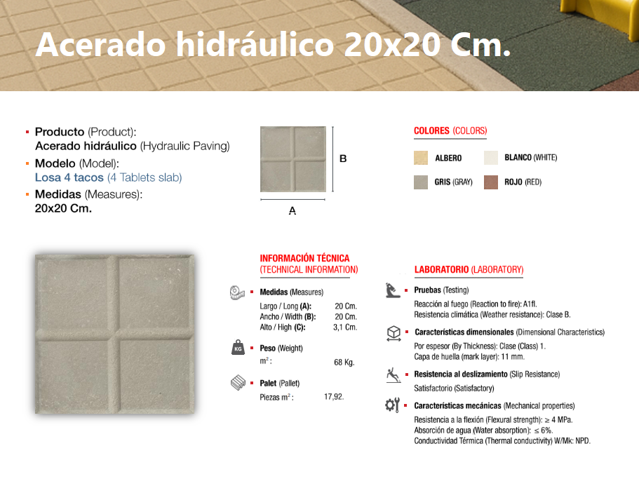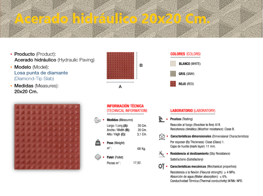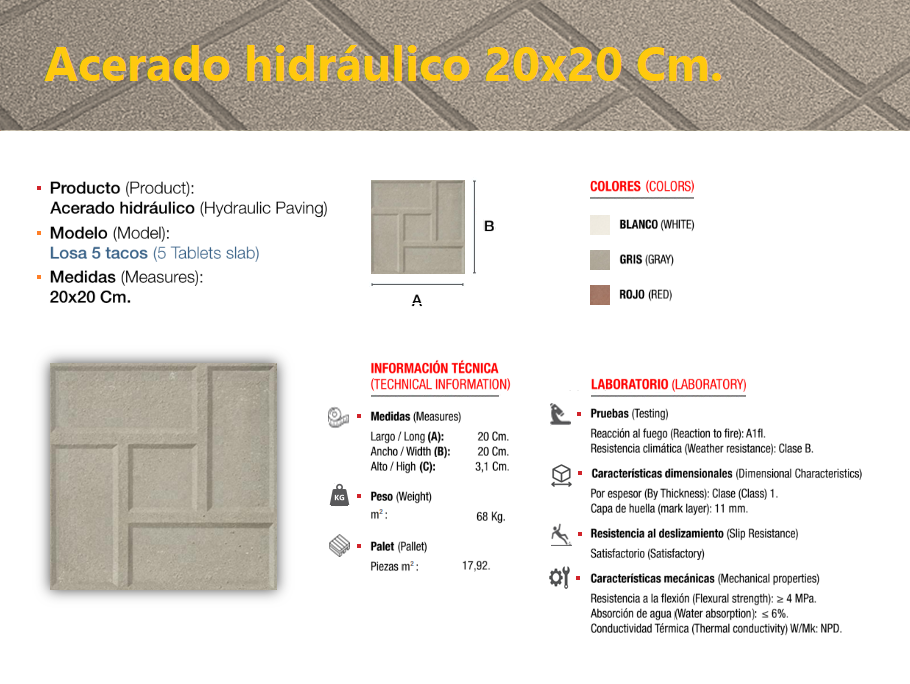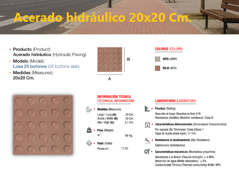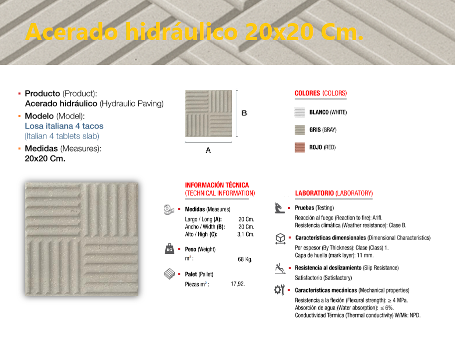 El acerado hidráulico es una solería compuesta de áridos (de diferentes granulometrías) cementos y colorantes, el cual se compacta y se deja sin pulir, llevando tan solo grabada, en su cara vista, el dibujo que le confiere su nombre característico, dándole un perfecto acabado estético y antideslizante, ideal para su colocación en zonas de paso en el exterior, especialmente en zonas públicas.