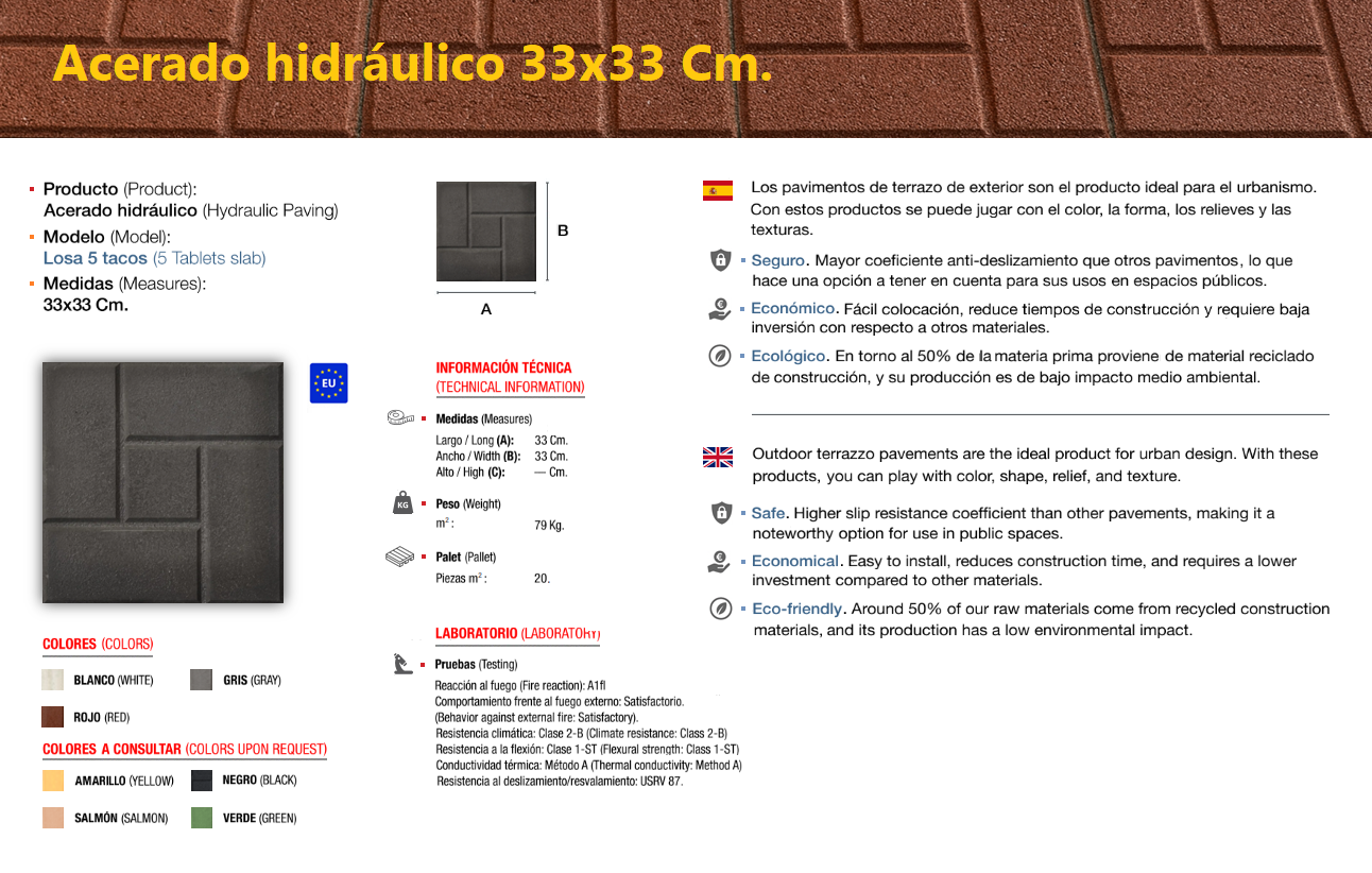 El acerado hidráulico es una solería compuesta de áridos (de diferentes granulometrías) cementos y colorantes, el cual se compacta y se deja sin pulir, llevando tan solo grabada, en su cara vista, el dibujo que le confiere su nombre característico, dándole un perfecto acabado estético y antideslizante, ideal para su colocación en zonas de paso en el exterior, especialmente en zonas públicas.