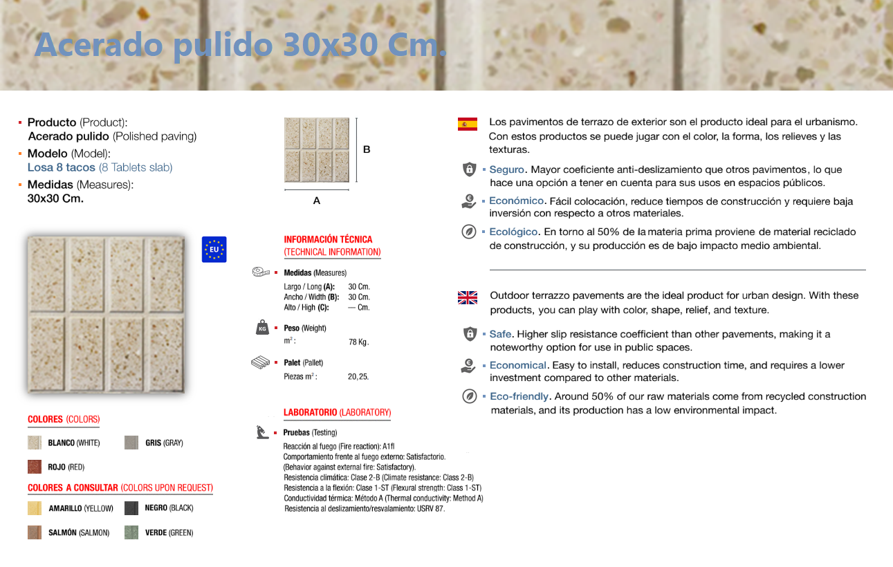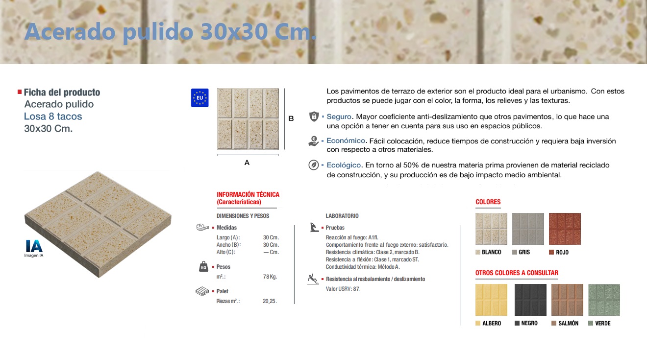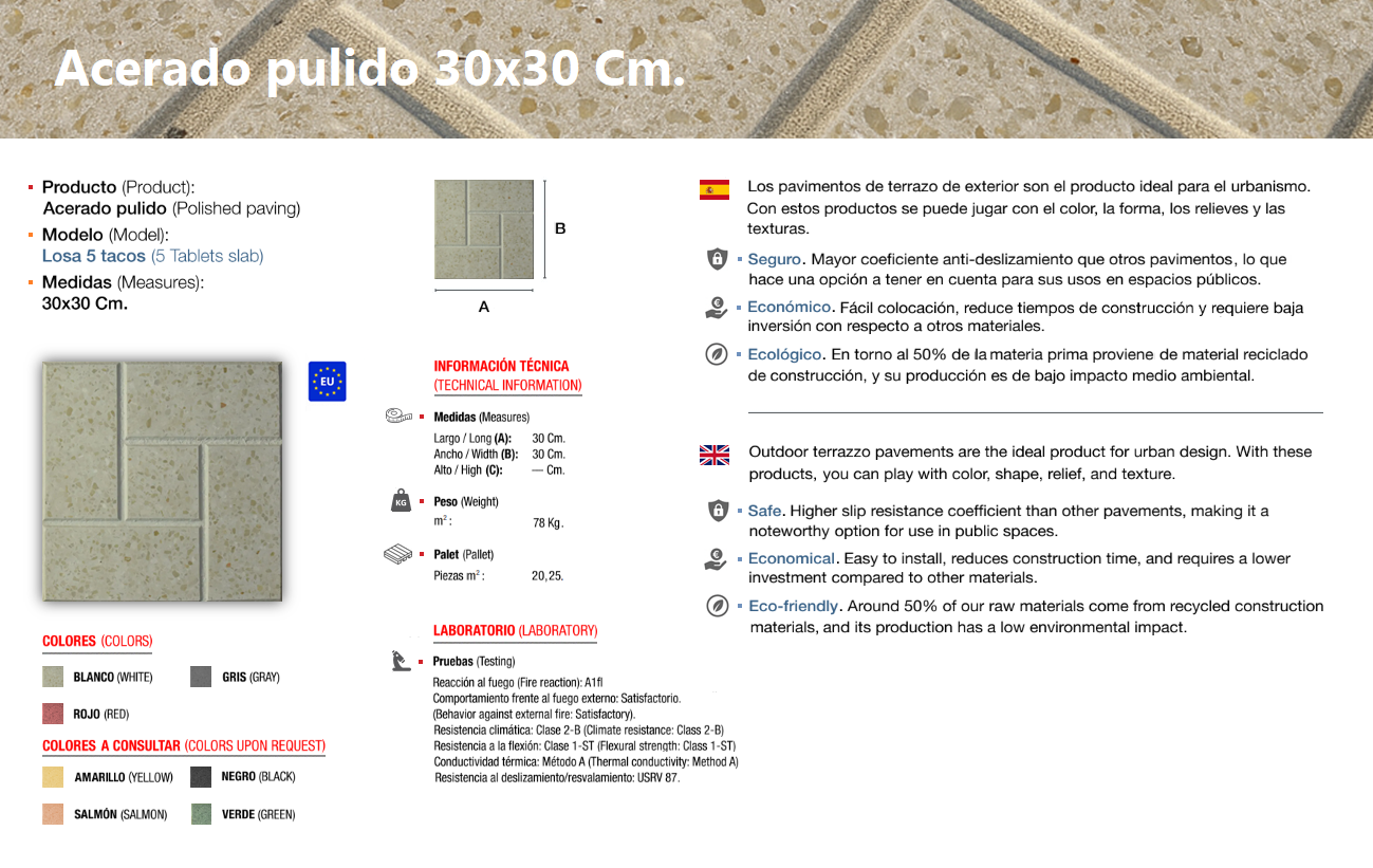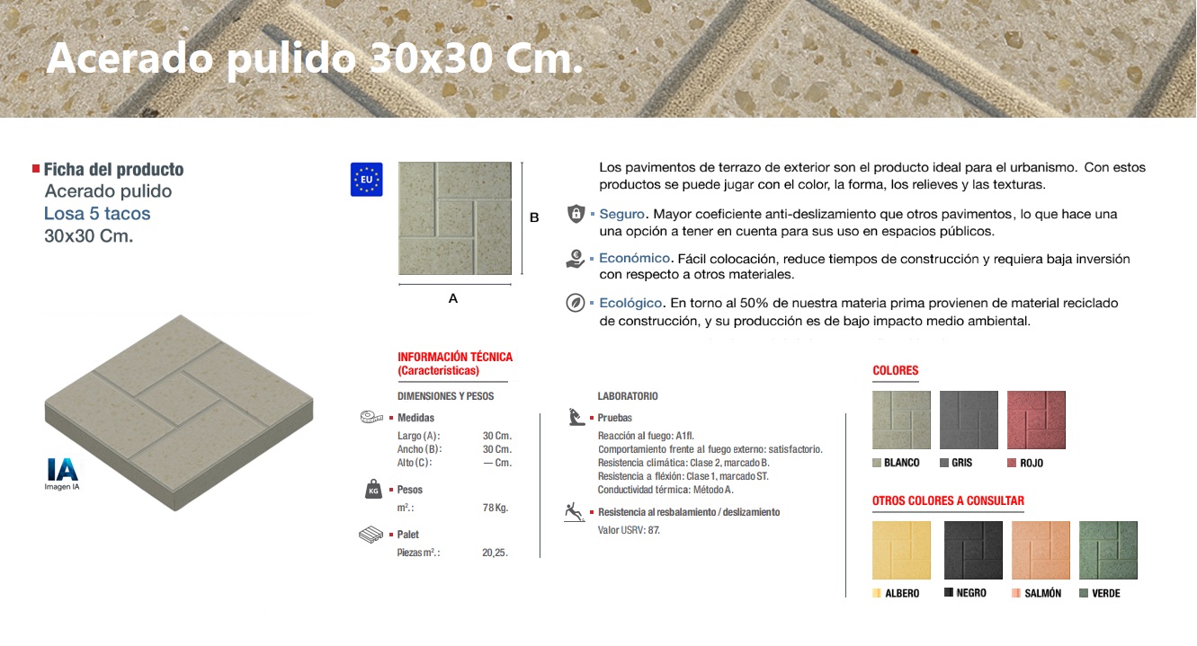 El acerado pulido es una solería compuesta de áridos (de diferentes granulometrías) cementos y colorantes, el cual se compacta y se pule en su cara vista, dejando entrever el grano que lleva en masa. Además irá impreso, en esta misma cara, el dibujo que le otorgará su nombre característico. Esta solería es muy usada en acerados públicos.