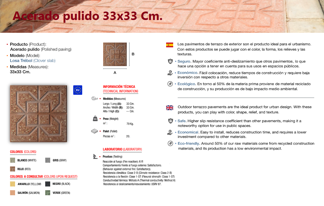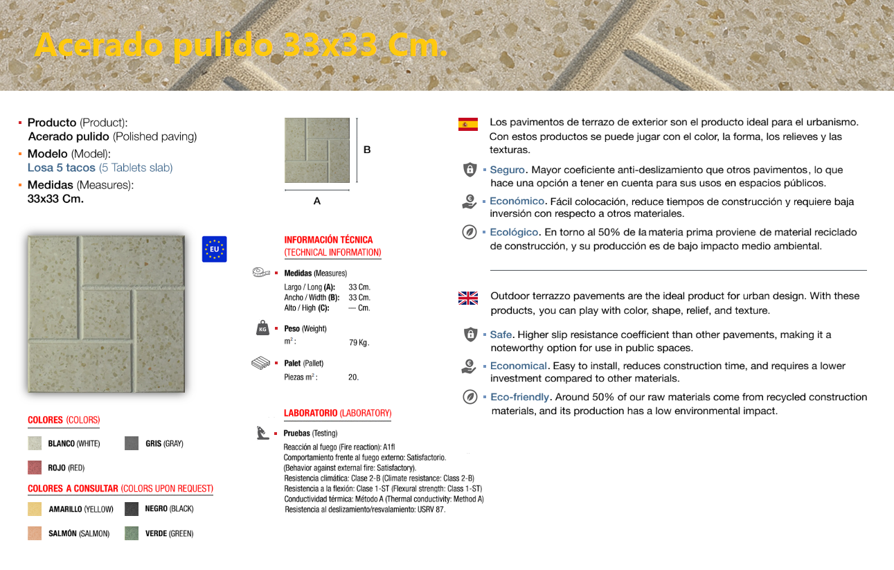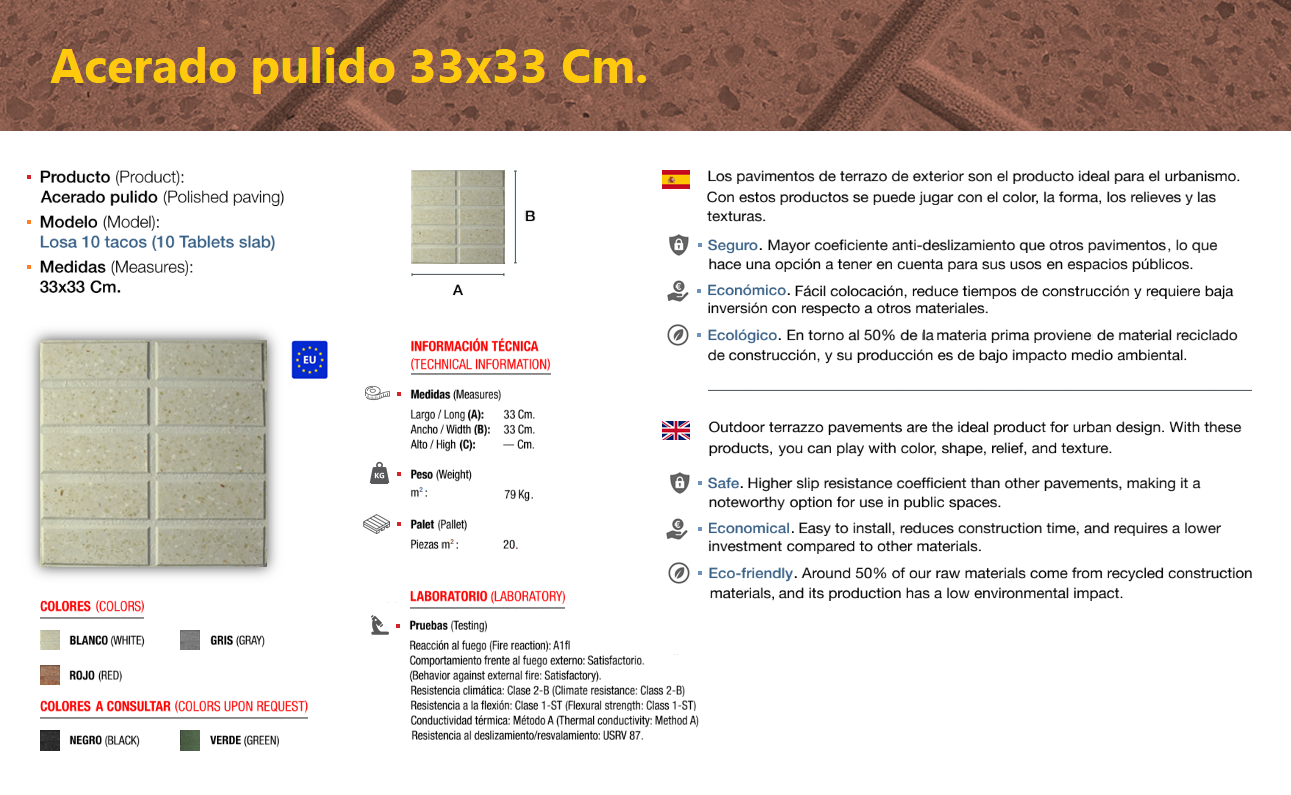 El acerado pulido es una solería compuesta de áridos (de diferentes granulometrías) cementos y colorantes, el cual se compacta y se pule en su cara vista, dejando entrever el grano que lleva en masa. Además irá impreso, en esta misma cara, el dibujo que le otorgará su nombre característico. Esta solería es muy usada en acerados públicos.