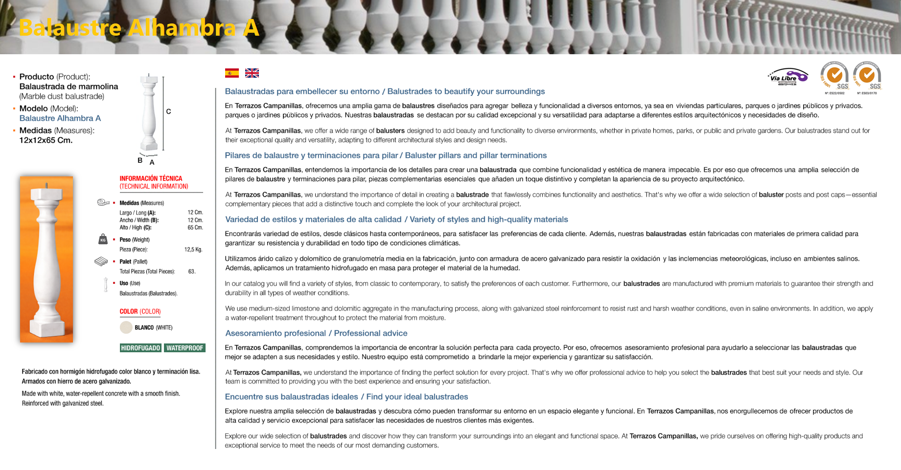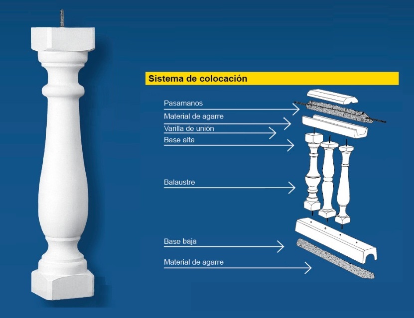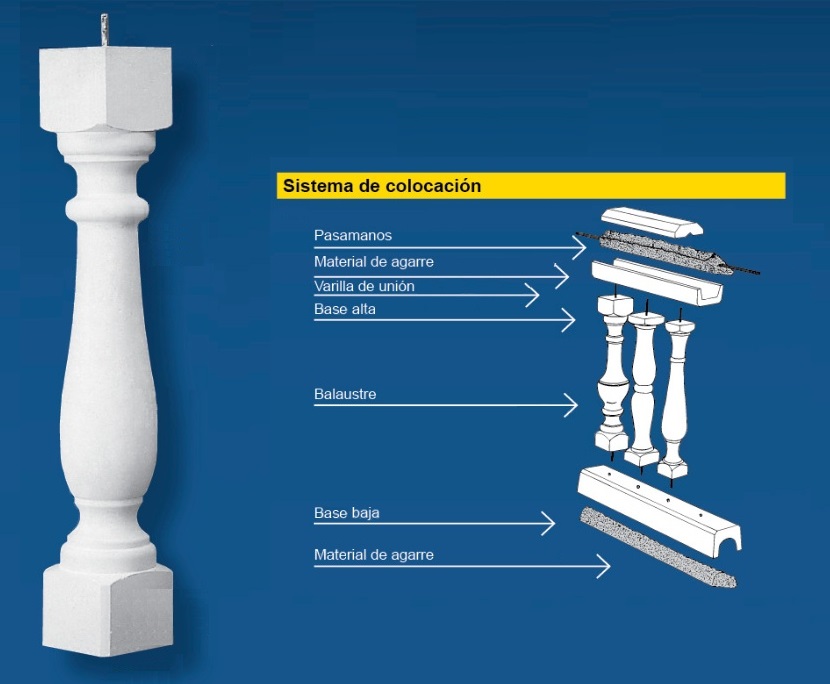 Un balaustre o balaústre (del griego, balaustion; latín balaustium, ‘flor de granada’) es una forma moldeada en piedra natural o piedra artificial, que soporta el remate de un parapeto de balcones y terrazas, o barandas de escaleras. El conjunto de balaustres se denomina balaustrada. La Piedra Artificial, también llamada Piedra de Mortero, Piedra Cultivada, o Piedra Reconstruida, es una alternativa a la piedra natural, prácticamente es un tipo de mortero especial que por su textura y color imita perfectamente la piedra natural. Compuesta por arena lavada, sílice, marmolina de diferentes colores, cemento, agua (para el fraguado) y aditivos especiales de última generación (plastificantes, fluidificantes, etc.) para mejorar las cualidades estéticas y de resistencia.